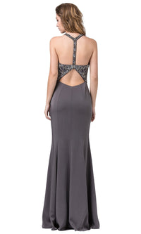Here's a dark silver gray formal dress that's pure sophistication. Hugging the curves through the hips, this form-fitting silver formal gown flatters your natural silhouette. The sheer bodice pops with sparkling beadwork, and additional beading creates a necklace-like design around the high neckline. A cut out adds even more drama to the bold open-back design of this high-neck formal dress. For an elegant look at prom and other fancy celebrations, wear this dark silver formal dress.